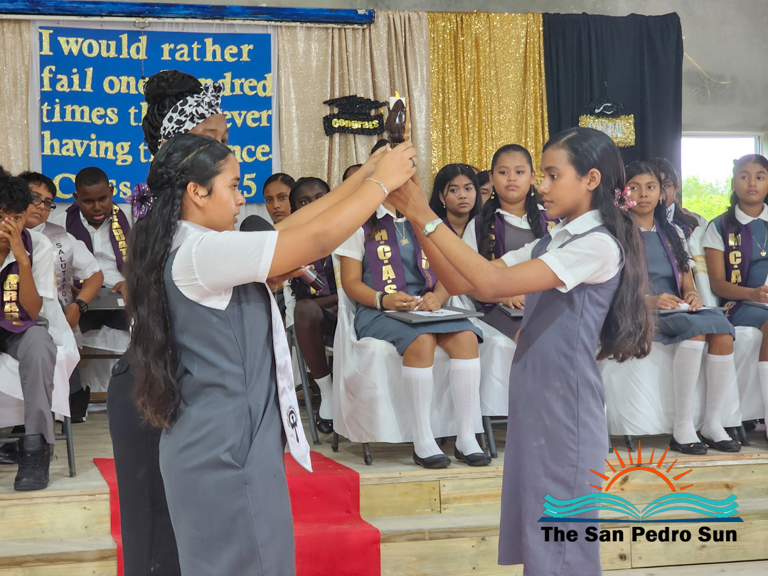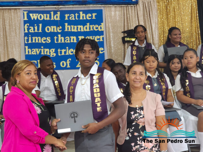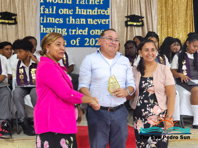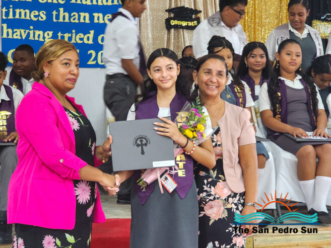 Maricruz Martinez and Principal Torres presented diplomas to each student, followed by the distribution of awards. Honorees included Hon. Minister Andre Perez, PC Gentle, Jorge Cante, Darlene Belgrave, Dr. Fr. Kesner Ajax, Maricruz Martinez, Mazey Lopez, Dernel Martinez, Matachica Resort, Freddy and Trejo, and Roque Martinez.