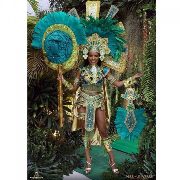 On Monday, December 10th Fraser took part in the Miss Universe National Costume Competition, where she proudly wore a costume depicting the Maya Sun God and the Jade Head, ‘Kinich Ahau,’ made by Belizean designers David Matus and Roberto Pasos Dominguez.