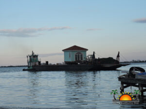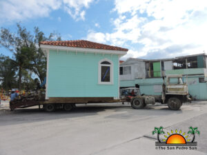 With SPBTIA Treasurer Pete Davis overseeing the big move, the property was first prepared for the building by digging and installing pylons and the necessary infrastructure. SPTC assisted in relocating coconut trees from the area and was very helpful during the entire process. “The initial plan was to place the building on a trailer and transport it to town during the late-night hours. After much excavating and planning, we decided that idea was not the best due to the size and weight of the building. Thanks to Island Construction’s generous donation in December, they came to the rescue, barging the building from the island’s east side to their marina in San Pedrito until conditions were good to barge it to the west side. A few weeks later, the barge landed directly north of the international water taxi terminal on the lagoon, where the building was loaded onto a trailer and driven to its location next to the House of Culture. This process took hours, traffic diversions, and a lot of breath-holding. We were quite relieved when the building settled at its permanent home!” exclaimed Sniffin.