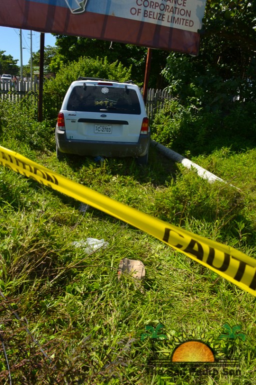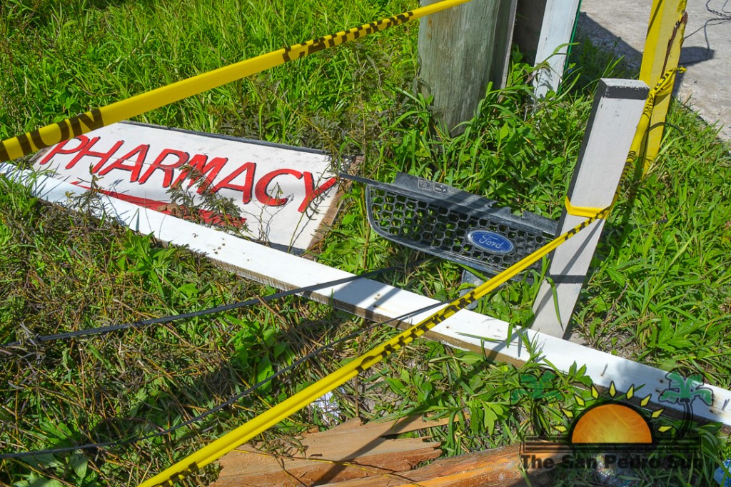 On Sunday, Febuary 2nd, the San Pedro Police Department and the San Pedro Traffic Department responded to reports of a car accident at the corner of Seagrape Drive and Mar del Tumbo Drive at around 4AM. Upon arriving at the scene, officers noted that the car had slammed into a utility pole located in the intersection of the street and then crashed into the fence of a corner lot in the area. The lower part of the utility pole was completely detached for the upper part, leaving the portion in mid-air, sustained only by the utility wires and cables.