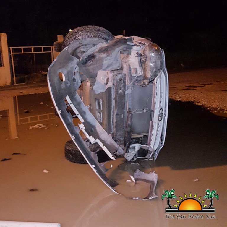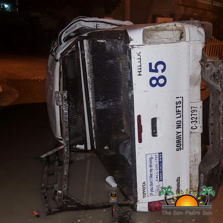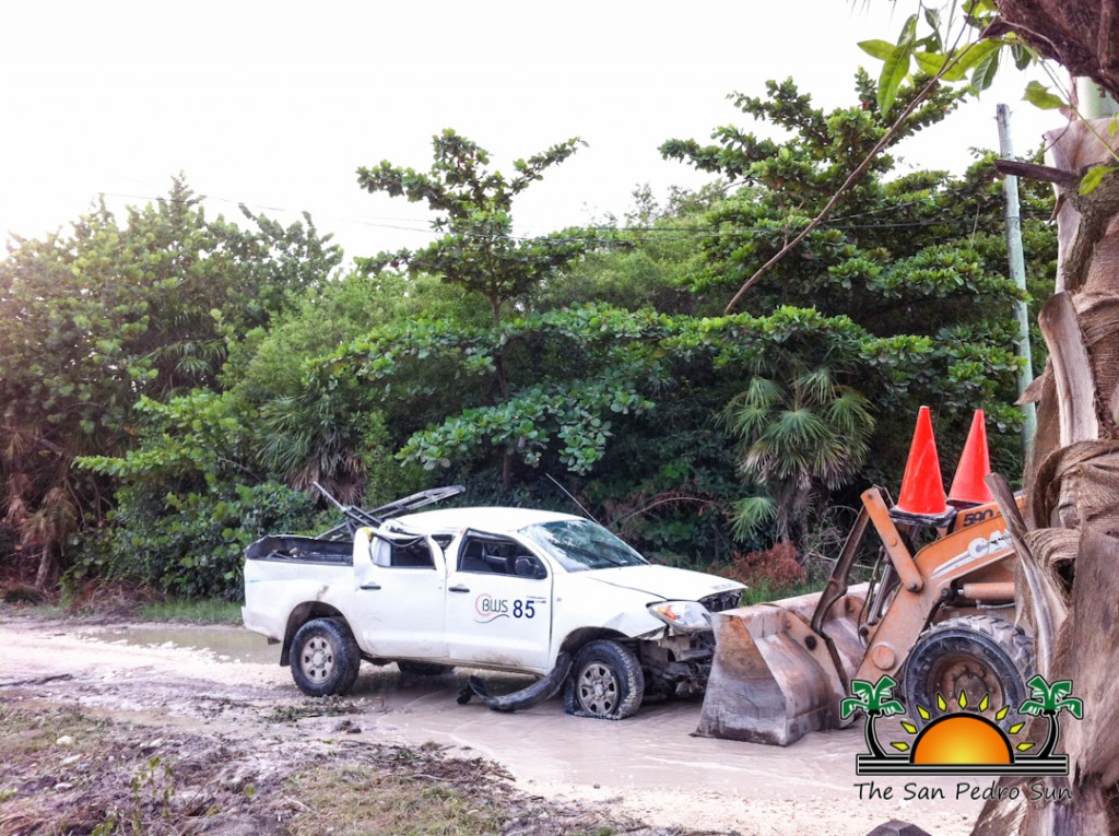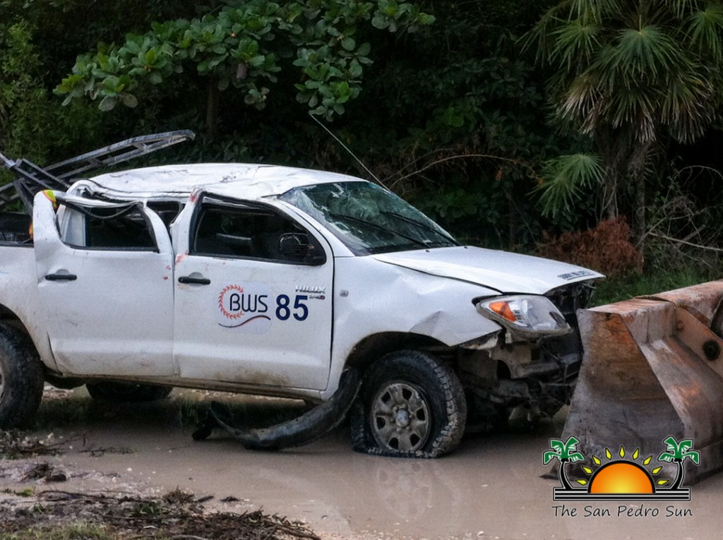 30-year-old Nolan Garbutt Jr, Belize Water Services (BWS) Assistant Supervisor, has reported to The San Pedro Police that on Wednesday, July 20th at around 10:30PM he suffered a car crash. He stated that he left Pedro’s Inn in a work issued white Toyota Hilux 4 door truck (Lp/# 32797, Model KUN25L-HRMDH Frame MROFR220800648564) heading home driving in a southerly direction. Garbutt went on to state that when reaching Sea Grape drive, he heard a loud bursting sound, and as a result, he lost control of the vehicle and flipped over. When he got out of the vehicle, he observed that the front and the back bumpers were broken, both left front and back wheels were punctured, the top was bent and the four doors were bent in.