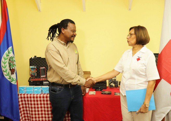 Minister of Transport and National Emergency Management, Hon Edmond Castro, this morning received on behalf of NEMO a donation of equipment from the Belize Red Cross to assist in disaster preparation and response. Making the donation on behalf of the Belize Red Cross was its Director General, Lily Bowman.