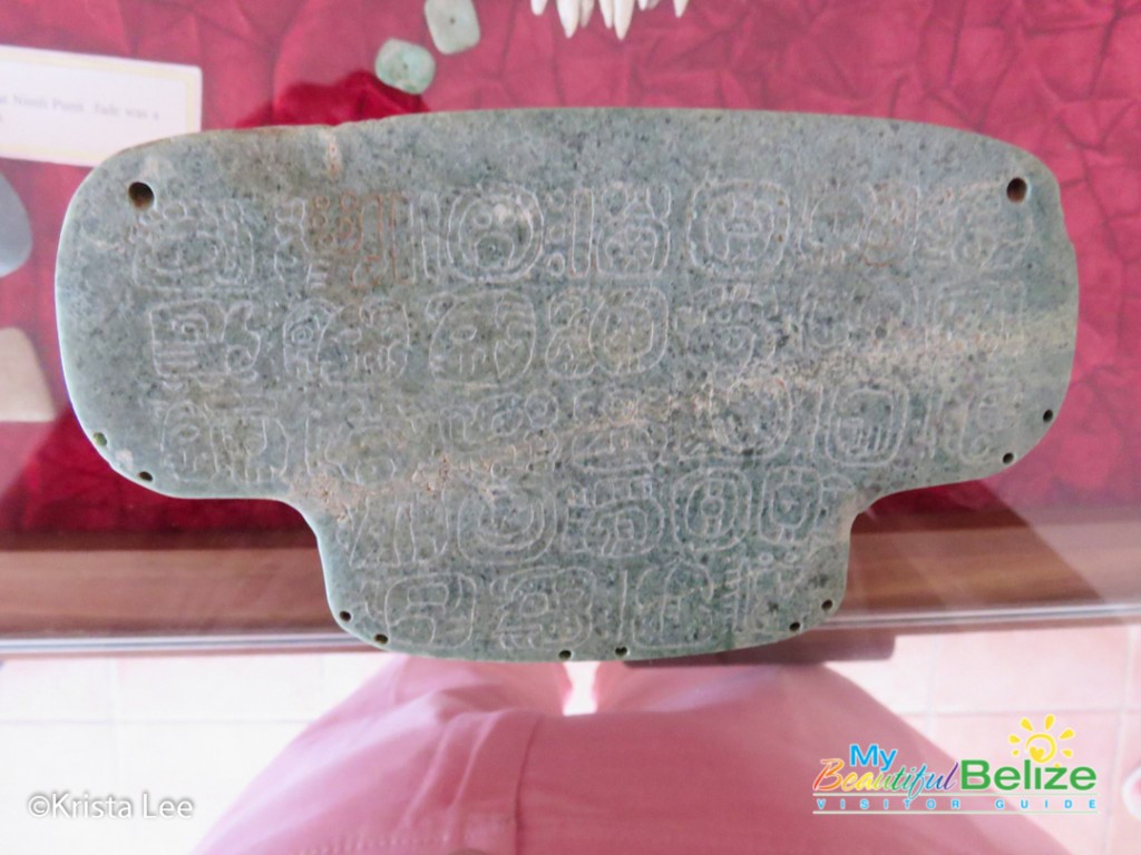 The remarkable story on the origin of the pendant sheds new light to Maya world. “It was brought here, it wasn’t made here, from Caracol in the Cayo District by a Lord of Caracol who came here to what was a much smaller site to celebrate an important event on the calendar. The Jade piece talks about this person that came, his name was Janaab K’inich. It also talks about his mother, whose name was the Holy Lady, and his father is mentioned and it says here that he came to do a ritual. Now what is interesting about that, is it tells us that the Lords here had very powerful relations with Caracol. We did not know that before, because there is no other way to tell from the artifacts here or from the other hieroglyphics. He came to do a scattering event, a form of a ritual sacrifice,” said Dr. Braswell.Nim Li Punit Maya Jade Pendant Archaeology Toledo Belize-10