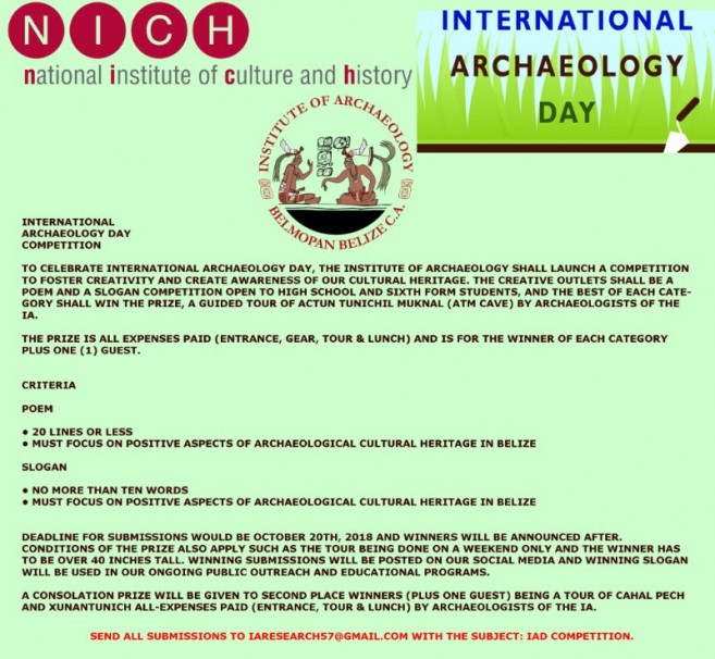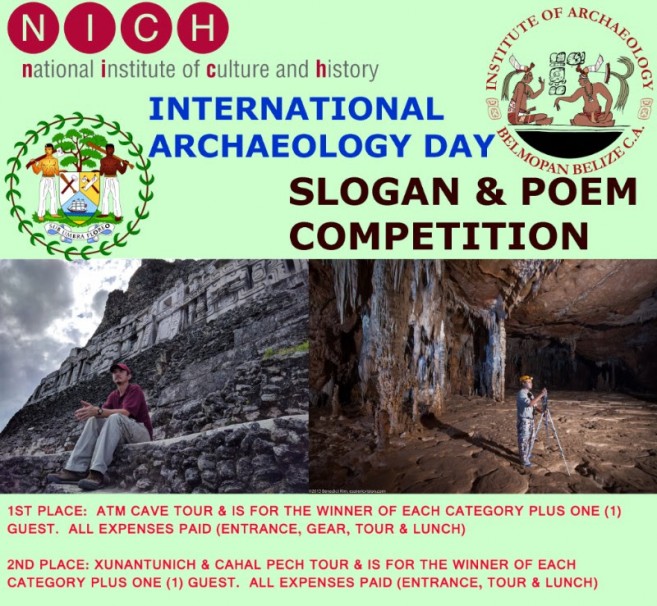 The Institute of Archaeology is launching a slogan and poem contest to celebrate International Archaeology Day 2018 which is October 20. The contest is open for both high school and junior college students. The Grand Prize for each category is an exclusive tour for two (2) of the Actun Tunichil Muknal (ATM) Caves with free entrance to the site, complimentary gear and lunch. Second Prize is a tour for two of Xunantunich and Cahal Pech with free entrance and complimentary lunch. Poems must be original works, focus on positive aspects of Archaeological Cultural Heritage in Belize and have a length of 20 lines or less. Themes must be original, focus on positive aspects of Archaeological Cultural Heritage in Belize and have a length of 10 words or less. Entries must be sent to [email protected] with the subject; “IAD Competition” no later than the 20th of October 2018, winners will be announced after.