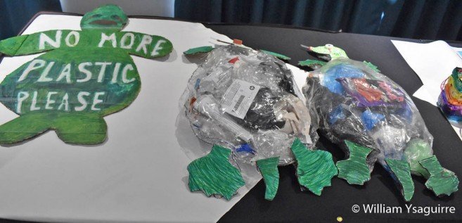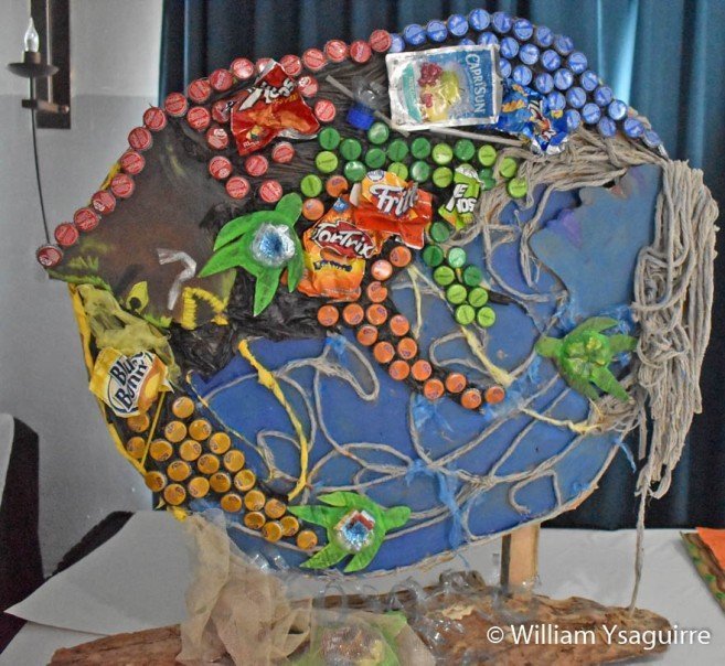 “Losing the Battle,” an angle fish sculpture created from plastic debris by jasmine, Andrew and Amaia Faber, won first prize in the high school category. “Refuse, Reuse and Recycle” was the theme chosen by the second prize winners Verule Garcia and Tayana Olivera of the Toledo Community College for their artwork: “The 3 R’s Project”.