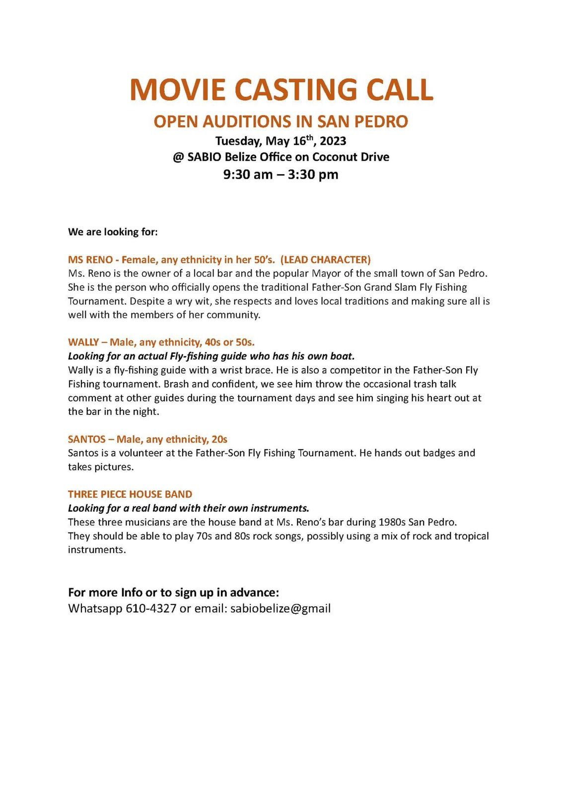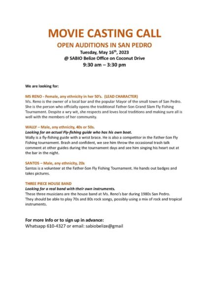 The Open auditions for three individual roles and a musical trio are scheduled for Tuesday, May 16th between 9:30AM and 3:30PM at SABIO Belize offices on Coconut Drive. Below are the details of the characters and their role in the film.