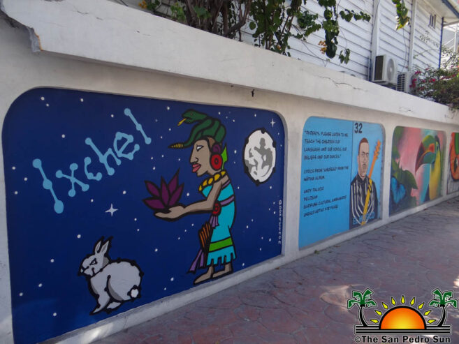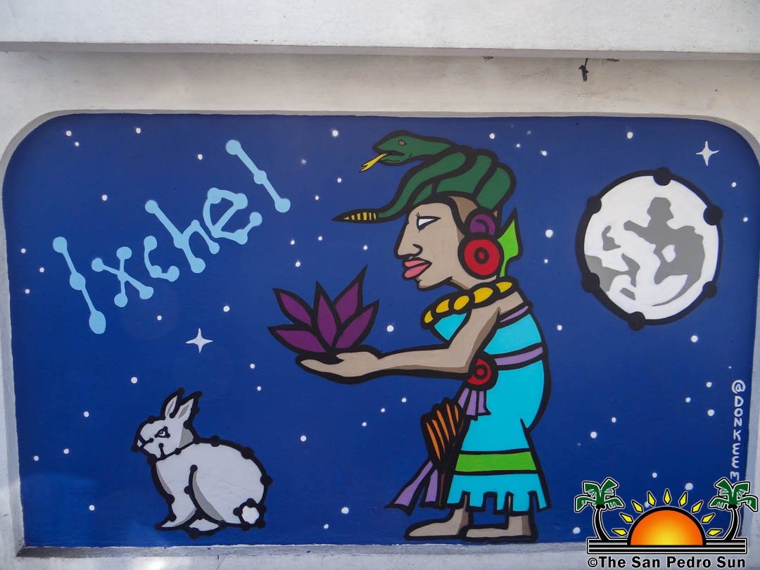 Alex and his mother painted two murals at the start of Barrier Reef Drive next to the Holiday Hotel. Sylvia gave life to the mural featuring Ixchel, the Maya goddess of the moon, love, gestation, medicine, and the textile arts. The goddess is also said to have been the wife of the sun god Ak Kin. Sylvia found it fitting as the island once hosted a sizeable Maya civilization. In fact, most of the island is considered an archaeological site, with the archaeological site south of town, Marco Gonzalez, standing as a testament to the ancient Maya presence on the island. Besides the moon and stars, Sylvia added a rabbit to the Ixchel mural representing the Maya entity.