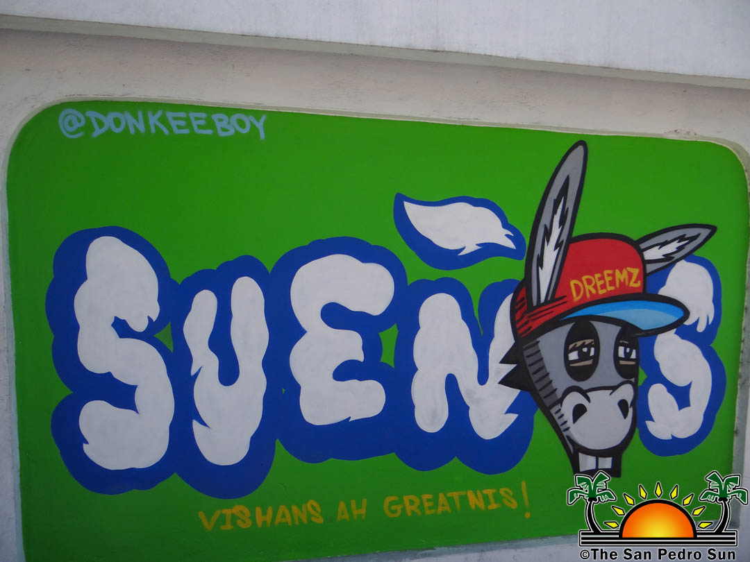 Another new mural showcases one of Belize’s most famous animals, the jaguar, painted outside of The Phoenix Hotel on Pescador Drive. The mural shows a beautiful jaguar sitting in the Belizean rainforest. Jaguars are a protected species in Belize, with the only reserve dedicated to its protection worldwide. Cardona and Mendoza III created the interactive mural previously done next to it by Alex, which features a golf cart and a caricature with the face of a donkey holding a fishing rod.
