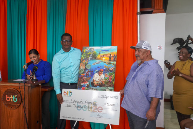 San Pedrano and well-known artist Edwardo ‘Papo’ Alamilla emerged as the top winner of the Belize Tourism Board‘s (BTB) art competition. The Belize Tourism Through Art competition was part of the activities leading up to World Tourism Day on Wednesday, September 27th. Papo Alamilla’s masterpiece, ‘Our People, Our Landscapes, Our Tourism,’ captivated a panel of judges well-versed in the arts by showcasing the country’s tourism landscape in all its beauty, including flora, fauna, and iconic attractions.