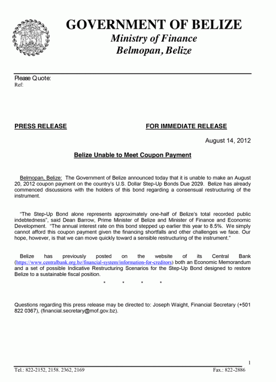 The Government of Belize today announced that it will not be able to meet its super bond payment to its creditors due for August 20th. The announcement was made via a press release from the Ministry of Finance shortly after midday on Tuesday August 14th. The Superbond payment amount due is US$23,497,211.11 at an interest rate of 8.5%. Prime Minister Dean Barrow is quoted in the release as saying that “The Step-Up Bond alone represents approximately one-half of Belize’s total recorded public indebtedness.”