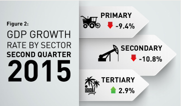 There was also a decline in the secondary sector, the manufacturing industries, during the second quarter. “Secondary activities declined by 10.8% during the second quarter of 2015, as most industries within this sector, with the exception of sugar, recorded decreased production. Despite the slight drop in sugarcane deliveries, sugar production grew by 18%, owing to an improvement in sugarcane quality. Consistent with the drop in citrus fruit deliveries, citrus concentrate production fell by almost half, from 2.4 million gallons in the second quarter of 2014 to 1.3 million gallons during the same three months of 2015. Crude petroleum extraction declined by 17%, while construction activities saw a decrease of almost 20%,” stated SIB.