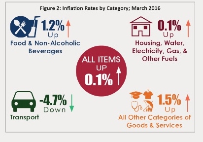 Across Belize’s seven towns, Corozal and Punta Gorda recorded the highest inflation rates of 1.7% and 1.3%. Over the first quarter, Corozal reported an increase from 1.0% in January to 1.5% in February. For the first three months of 2016, the inflation rate of Punta Gorda has been steady. San Ignacio, Santa Elena, and Belize City stood at negative 0.3%, while Dangriga records the lowest inflation rate of negative 1.0%, a downward trend from 4.0% in January and negative 0.9% in February 2016.