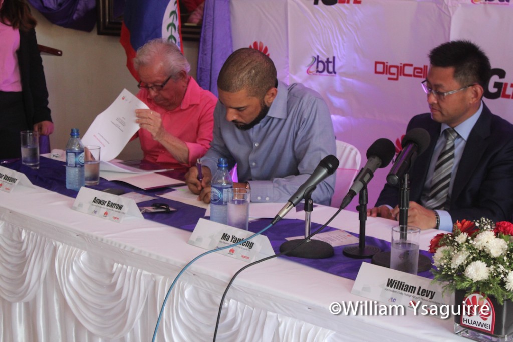 Nestor Vasquez Sr, Chairman of BTL’s Board of Directors, and Anwar Barrow, Chairman of BTL’s Executive Committee, signed the agreement with Ma Yanfeng, Vice President of Huawei Marine Networks Co. and William Levy, Vice President of Sales for Huawei Technologies China.