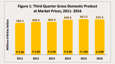 The latest figures for October 2016 were released by the Statistical Institute of Belize (SIB) on Wednesday, November 30th. The figures show that the country has experienced three consecutive quarters of negative Gross Domestic Product (GDP) growth, and indicated that Belize’s economy is still in a recession. The first quarter saw a contraction of 0.2%, the second, 1%, while the third quarter showed a contraction of 0.8%.