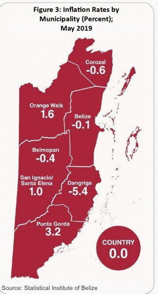 Punta Gorda Town experienced the highest monthly increase in consumer prices, recording a 3.2% inflation rate for May 2019. Consumers in Punta Gorda experienced above-average increases in ‘Food and Non- Alcoholic Beverages,’ home rental costs, and admission fees to sporting events. Meanwhile, Dangriga Town reported the lowest inflation rate for the month, with prices declining by 5.4 % on average in this municipality. Consumers in Dangriga Town experienced significant decreases in home rental costs and outpatient medical services such as surgery costs and lab fees.