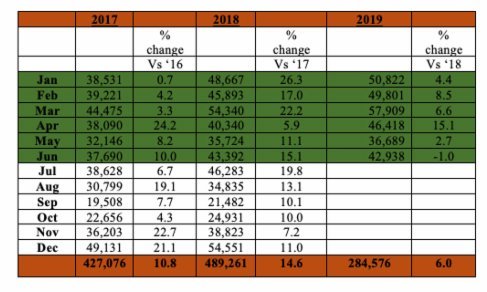 At the end of the second quarter of 2019, there was a cumulative increase of 6% in overnight tourist arrivals for 2019 over 2018. As the off-season approached June experienced a slight dip of approximately 400 visitors in comparison to last year. At mid-year, a total of 284,576 visitors have experienced our diverse tourism destination and attractions.