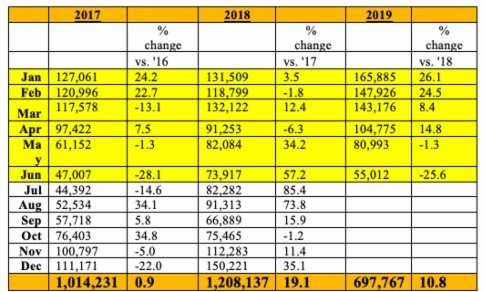 June also reflected an approximate 18,000 fewer cruise visitors when compared to the previous year. Despite that dip, the first half of 2019 cruise passenger arrivals totaled to an approximate of 700,000 visitors, which represents a 10.8% increase over 2018. Furthermore, there were seven more cruise ship calls in comparison to 2018.