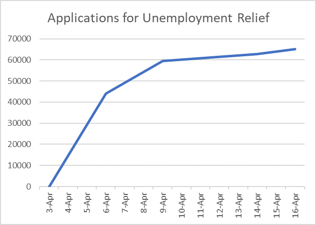 As shown on the graph, the bulk of the applications for unemployment relief program were received in the first six-day period of April 3rd to 9th. Since then, applications have tapered off significantly.