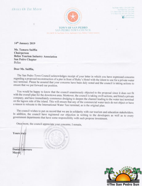 In the past, The San Pedro Town Council (SPTC) has publicly expressed its disapproval, stressing that the only place they should move to is to the Sunset Boardwalk. Mayor Guerrero has publicly said that his administration is against the project and will not support it. If SPBE decides to go ahead and apply for a permit to dredge, they will have to get a recommendation from the SPTC. Guerrero indicated that they would object to it and hopes that the Ministry of Natural Resources will respect their decision and not grant the permit. The SPTC even shared their disapproval via a letter addressed to the San Pedro Chapter of the Belize Tourism Industry Association in January 2019.