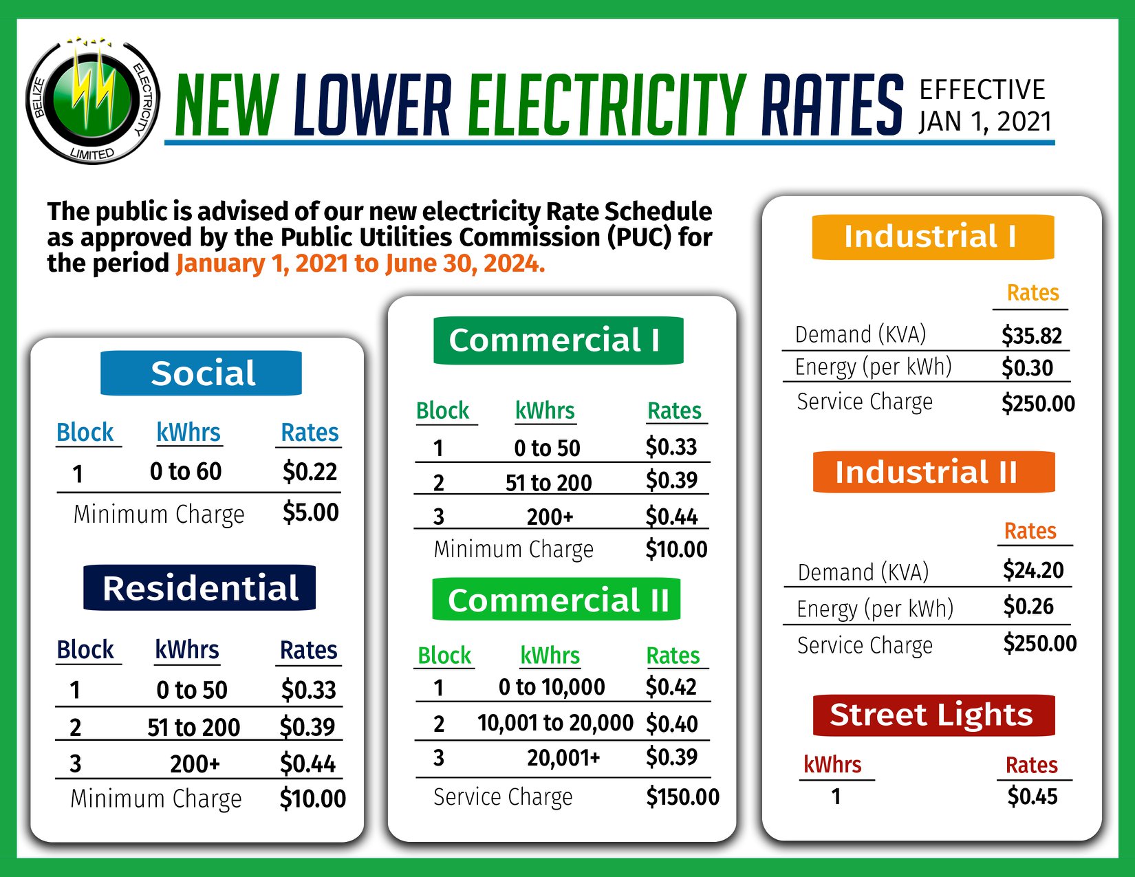 Belizeans should expect their next electricity bill to reflect lower rates that came into effect on January 1, 2021. The reduced electricity rate, under 2.9%, was approved by the Public Utilities Commission (PUC) and will be in effect until June 30, 2024.