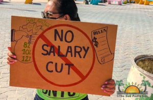 Throughout 2021, government workers, particularly teachers, protested countrywide against the proposed salary cut. In San Pedro Town, teachers were visible on the streets with placards denouncing the plan. They asked the government to collect the overdue taxes owed by large companies instead of reducing their salaries to balance the 2021 budget. Cabinet approved the reduction despite these peaceful demonstrations, and public servants reduced their weekly working hours to compensate for their consolidated pay.