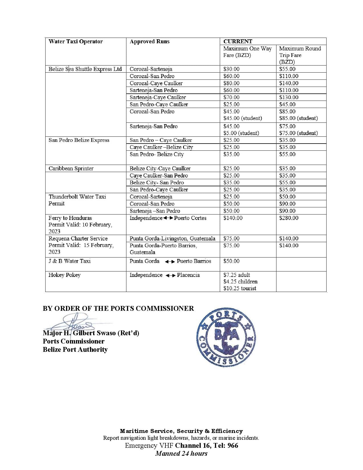 The Belize Port Authority (BPA) issued a release on Friday, April 8th setting out the approved passenger fares for water taxis. The BPA clarified that it has not approved any increase in fares, and advises water taxi companies that any increase above the approved rates is unlawful, and carries a charge of up to $5,000 per ticket sold at the unapproved price.