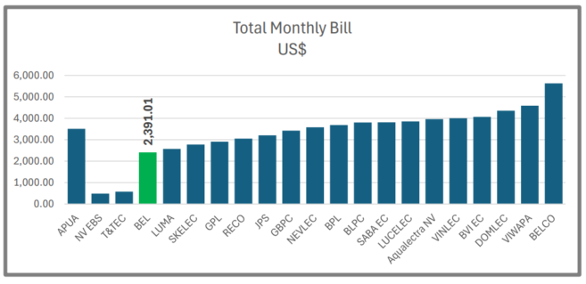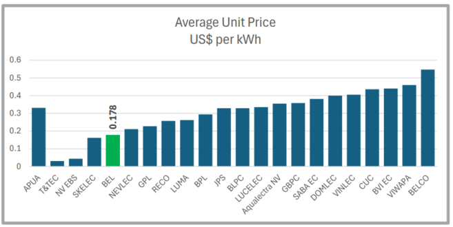 When comparing BEL to other utilities, BEL stands out in several positive ways, especially with its total monthly bill and average unit price for residential customers using 100 kWh per month. BEL’s average unit price is impressively low at US$0.178 per kWh, which sets it apart from other regional utilities. For example, Antigua Public Utilities Authority’s (APUA) average unit price is US$0.3312, Aqualectra NV’s is US$0.3552, Bermuda Electric Light Company’s (BELCO) is US$0.5473, BVI EC’s is US$0.4400, and Caribbean Utilities Company’s (CUC) is US$0.4357.