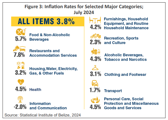 The Statistical Institute of Belize (SIB) released its mid-year Consumer Price Index (CPI) report for July on August 28th, 2024. The report revealed that the CPI, which summarizes price levels across all consumer goods and services categories, rose to 118.9 from 114.6 in July 2023, resulting in a national inflation rate of 3.8%.