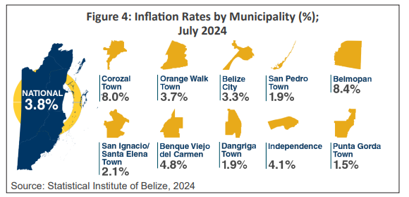 The City of Belmopan continued to record the highest increase in consumer prices among all the municipalities, with an inflation rate of 8.4% for July 2024. Consumers within this city experienced higher than average prices for food items, non-alcoholic beverages, home rental costs, restaurant services, hotel accommodation rates, personal care products, laundry products, soaps, detergents, domestic services, pet foods, medicines, medical services, doctor’s office visits, and clothing.