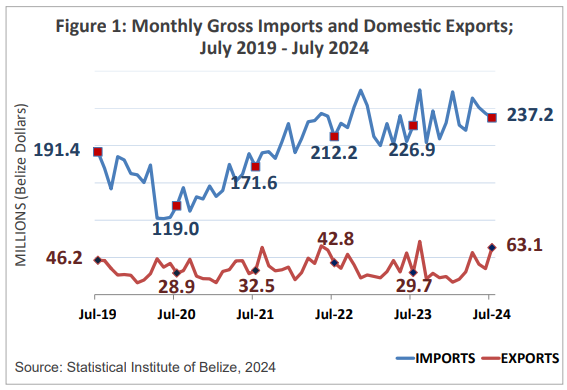 During this period, Belize experienced increases in both imports and exports. In July 2024, the total value of Belize’s goods imports was $237.2 million, showing a 4.6% increase, or $10.3 million more than in July 2023, when imports were valued at $226.9 million. Imports increased across most categories, with the most significant increases seen in ‘Mineral Fuels & Lubricants’ and ‘Food and Live Animals.’ For the same month, merchandise exports amounted to $63.1 million, marking a significant 112.2% increase, or $33.4 million more than the $29.7 million worth of exports in July 2023.
