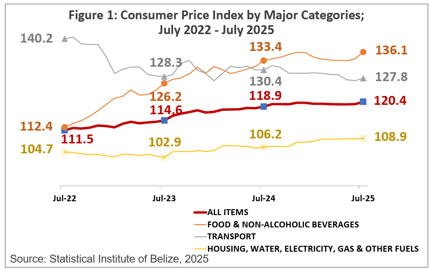 For the first seven months of 2025, Belize recorded a year-to-date inflation rate of 1.4% compared to the same period in 2024. The rise was driven mainly by higher prices in food and non-alcoholic beverages (2.4%), housing, water, electricity, gas, and other fuels (2.4%), and personal care products and services (3.2%), which together accounted for nearly 90% of the increase. Significant gains were noted in breads, fresh fruits, meats, beverages, home rentals, LPG, and personal care items such as deodorants and lotions. Restaurant and café services rose by 2.1%, furnishings and household services were up 1.9%, and clothing and footwear increased by 2%. In contrast, transport declined by 1.4% due to lower fuel prices, and information and communication fell by 1.7%, reflecting cheaper cellular phones and televisions.