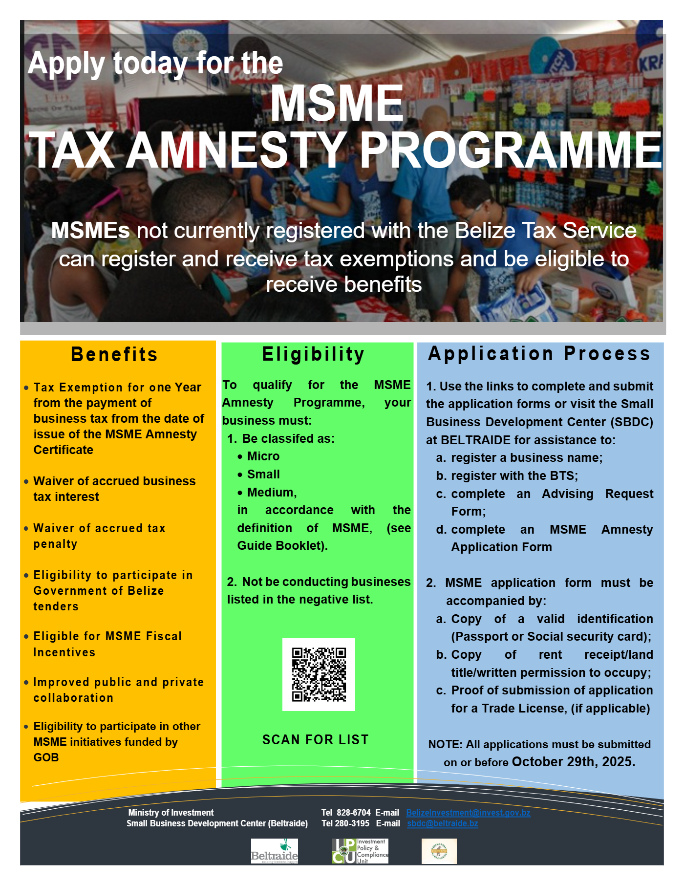 The Office of the Prime Minister (OPM) officially launched the Fiscal Incentive MSME Business Tax Amnesty Program on September 19th in Belmopan. The initiative, supported by the Ministry of Investment’s Investment Policy and Compliance Unit (IPCU), the Belize Tax Service (BTS), BELTRAIDE, and the Economic Development Council (EDC), is designed to help micro, small, and medium enterprises (MSMEs) formalize their operations with the BTS.