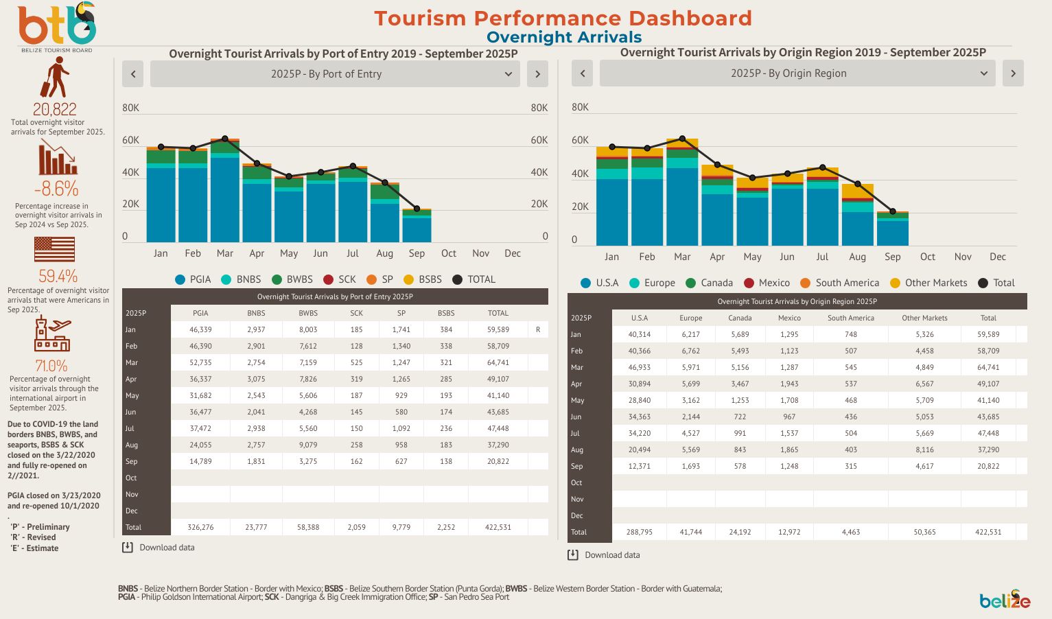 The Belize Tourism Board (BTB) has released its September 2025 tourism statistics, revealing 20,822 overnight tourist arrivals, an 8.6% decline compared to the same month last year. The data, published on October 28, 2025, was compiled from key points of entry across the country and highlights a decline during what is traditionally one of Belize’s slower travel months.