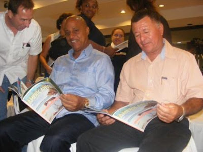 Prime Minister of Belize Dean Barrow and Honorable Manuel Heredia Minister of Tourism, Civil Aviation and Culture going through their copy of American Way