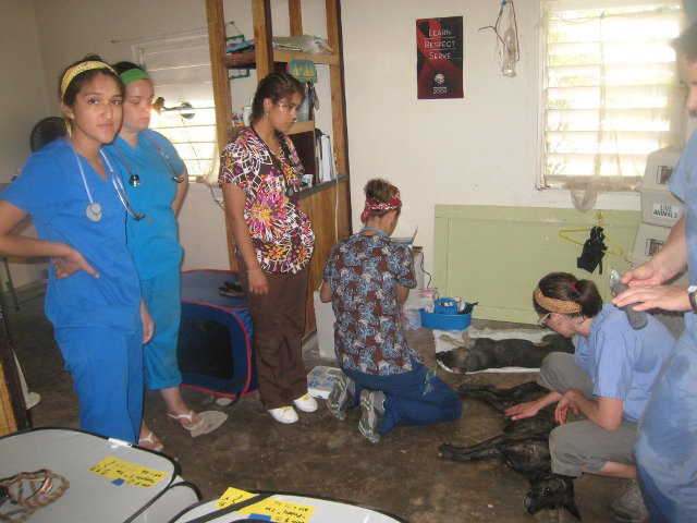 During June, 2011, Belize’s Institute for Sustainable and International Studies (ISIS) organized three low cost spay and neuter clinics for animals across Belize. Two ISIS veterinarians, Dr. Edwardo Tesecum and Dr. Isabelle Paquet-Durand, along with visiting ISIS veterinary faculty, Dr. Emma Gardner and Dr. Kirstin Bubeck of Tufts University, supervised the work on the animals. The clinics, in Belmopan, Bullet Tree Falls and Sarteneja were a win-win for the local communities and students from ISIS. Animal Science students who came from Veterinary schools and Universities across the U.S. and Canada to participate in the ISIS four week animal science program in Belize. The students’ fees help fund the clinic work and they get field experience working with the vets.
