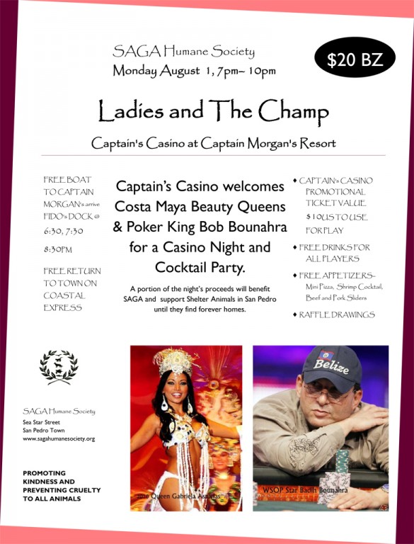 Support SAGA Humane Society on Monday, August 1, 2011 with the ladies of Costa Maya and World Series of Poker finalist Badhi “Bob” Bounahra. Enjoy Cocktails and Casino night, have lots of fun while mingling with beauties and Belize’s Champ poker player.
