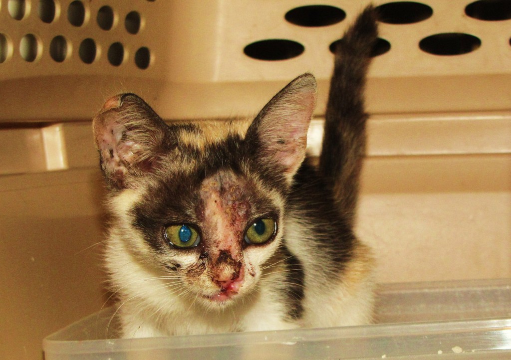 Press Release – SAGA – September 21, 2011 – They say that ‘curiosity killed the cat’ and in Lucky’s case, this almost came true. Darling little Lucky was brought into Pampered Paws looking like he’d been fighting a war – and he was the loser. It is believed that his terrible facial injury was due to an unfortunate encounter with a raccoon.