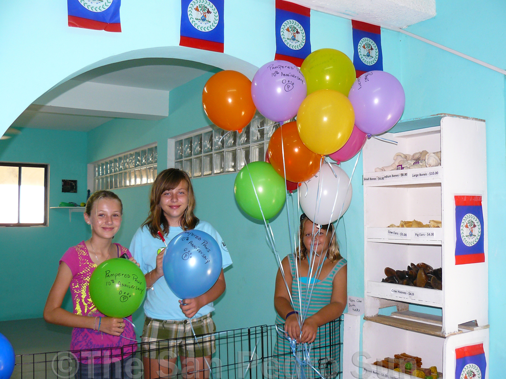 Pampered Paws, San Pedro, celebrated its tenth anniversary this past Saturday, September 24th. To commemorate the occasion, there was quite a bit of excitement, décor and yummy treats for the pet owners who stopped by for some pet pampering. Adorable volunteers Alice, Morgaine and Lily played with the doggies that were boarding at Pampered Paws, while Allan Soto, David Bellini and Derio Pop were busy grooming, bathing, walking and cuddling their clients.