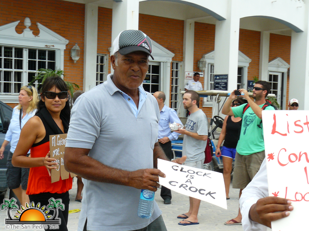 On Monday morning, October 31st, Mayor Elsa Paz appeared on The Reef Radio’s “Good Morning San Pedro” in an attempt to defend her project. On the show she all but called everyone objecting to her town clock, “uneducated” and demanded that unless 1,500 registered voters objected to her project, she would not listen. She further insinuated that many residents, because they are not Belizean Citizens, did not count. At noon on the same day the demonstration occurred as planned. About 150 residents of the island gathered at the location where the clock is being constructed. Along with several police officers, Channel 5, Love FM and the Ambergris Today covering the protest, the demonstration commenced.