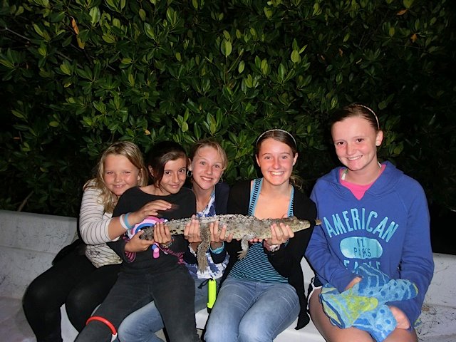 Morgaine Jones celebrated her 13th birthday with friends while on a very special “Croc Eye Shine Tour” with the American Crocodile Education Sanctuary/ACES team. The young animal enthusiasts enjoyed learning about crocodiles and their habitats while using flashlights the ACES team spotted the red eye-shine of the reptiles hidden within the mangroves. The highlight of the night was when the girls had the opportunity to partake in the release of a small croc that had been under the care of ACES. Deemed healthy and ready to be released; the party girls chose to name the croc Felix and bid him a farewell back to the wild.