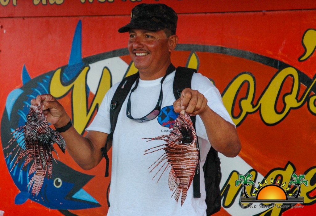 Wahoo’s Lounge held a Lionfish Tournament that coincided with Hol Chan’s Reef Week activities. The tournament saw 3 groups join in the fight to stop the rampant lionfish invasion. The lionfish were believed to have been introduced into the Atlantic Ocean in the 1980’s via the US aquarium trade. With a lifespan of over 15 years and growing up to approximately 20 inches, the lionfish is a voracious carnivore that consumes over 56 species of fish and many invertebrate species up to half its body size. The Lionfish possess venomous spines capable of deterring predators (and inflicting serious stings and reactions in humans). Capable of inhabiting all marine habitat types and depths, a single female lionfish can spawn over 2 million eggs a year, reproducing gelatinous masses of eggs that can disperse over a large body of water, every four days.