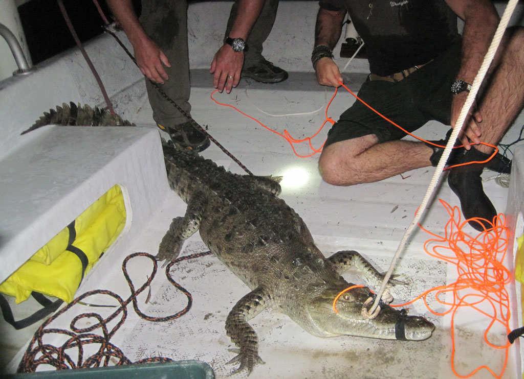 Typically crocs habituate within the mangrove swamps of the island’s western lagoon, but Rose theorizes that this croc was sticking around the beachside area because he had found a good food supply. “Chances are people who are coming in from fishing are cleaning the fish at their docks and they like to attract and watch marine life like rays that come in for the food. This also means a food source for the croc. As long as he’s got a constant source and no other crocs to compete with he’s going to stick around,” explained Rose. The Animal Behaviorist went on to say, “We are pretty certain this is the croc that bit the spear-fisherman. The size is right based on sightings and the bite marks are consistent for an animal this size. Since we captured the croc there have been no reports of a croc in the area, so we are confident this is our culprit.”