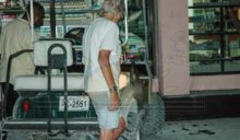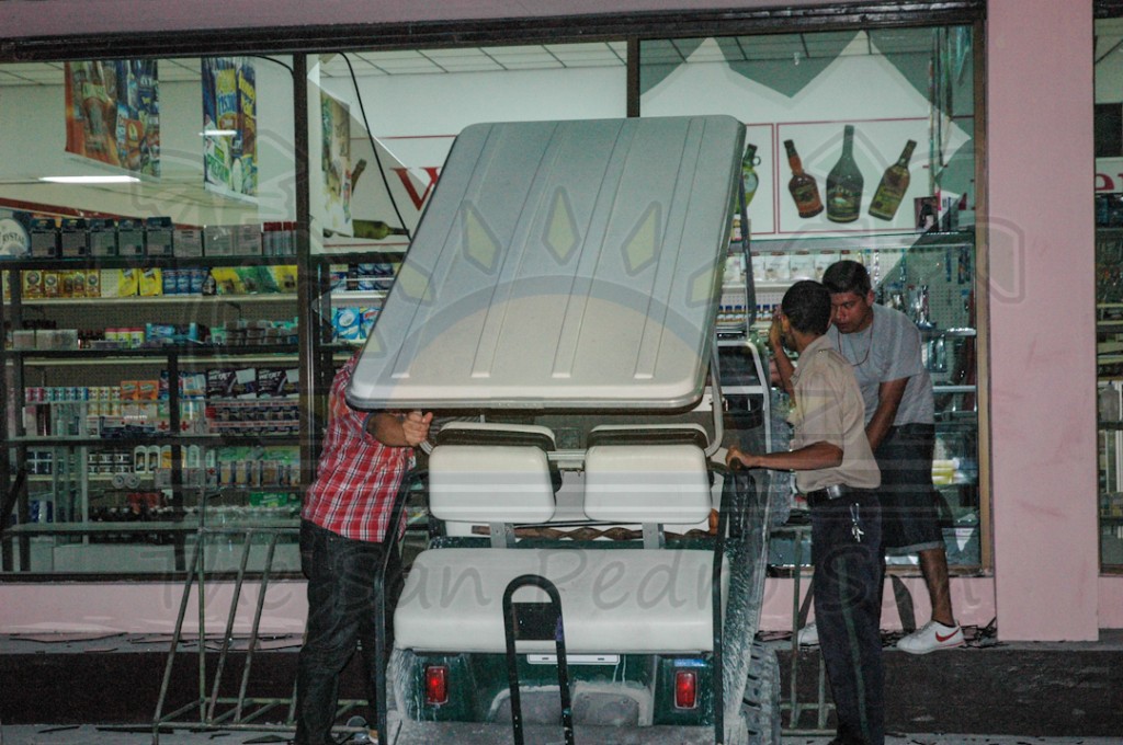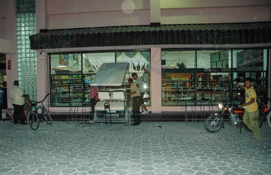 The green golf cart bearing license plate number SPC 2551 was being driven by 78 year old Graham Whitehead who mistakenly hit the accelerator pedal instead of the brake while headed in the northern direction of Coconut Drive. The golf cart was removed from the glass window with the assistance of the shop workers and police officers. Whitehead sustained a minor cut to the left knee and was escorted to the Dr Otto Rodriguez Polyclinic II to check for any further medical conditions.