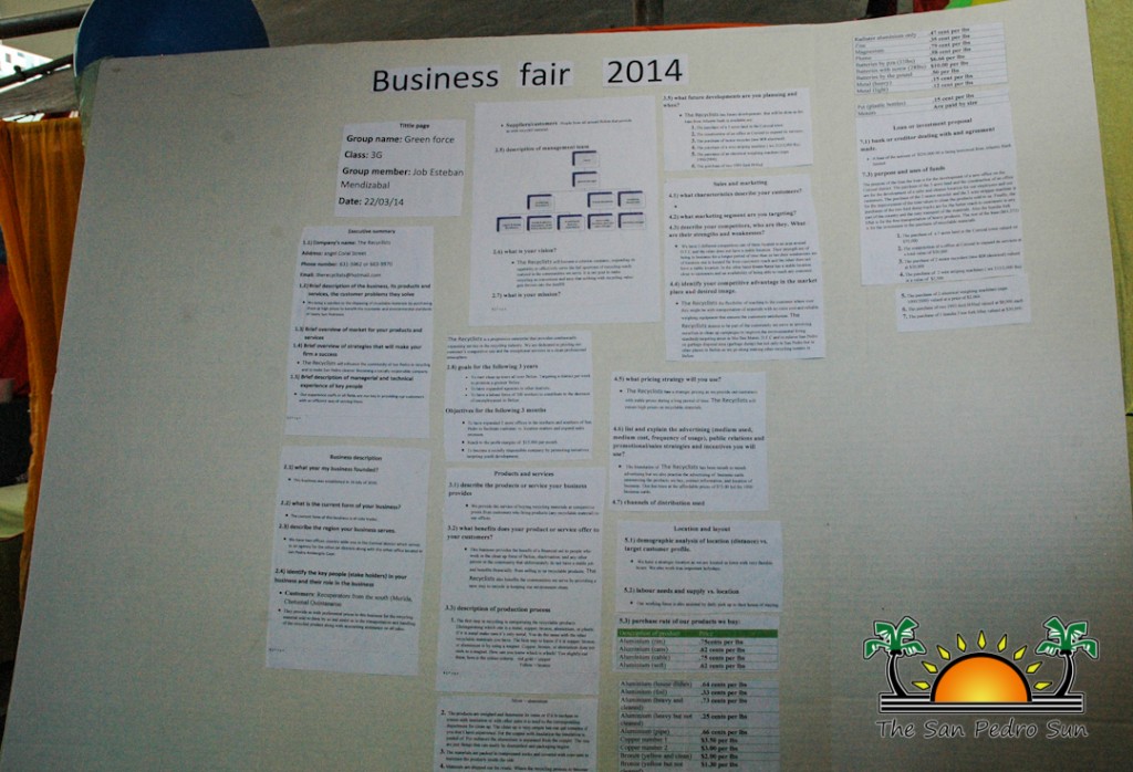 SPHS 2014 Business Fair-9For the juniors it was “San Pedro Glass Shop” which took the first place. The group, led by Kristy Medrano, created an impressive business venture that provides glass panels. There was a tie for second place between “Aquaponics” and “I Lava Tiki”. The judges were amazed by the “Aquaponics”, led by Chelsea Munoz, who created an aquaculture business venture to provide year round produce and tilapia fish to San Pedro. “I lava Tiki”, led by Ethel Villatoro, wowed the judges with their creation of a gift shop that sells local hand craft and eco friendly souvenirs. There was yet another tie in third place between “Knit Fit” led by Milane Cadel and the one man show, “The Recyclist” led by Job Mendl Zabal. All the winners received generous cash prizes donated by SPHS.
