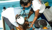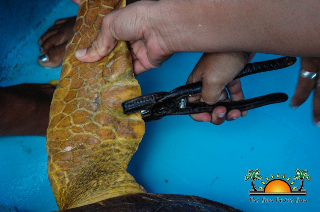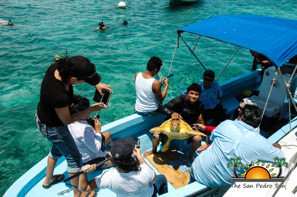 Once the turtles were both tagged, measured, samples extracted for genetic analysis as part of the turtle data base, they were released at Shark Ray Alley within the Hol Chan Marine Reserve located between Ambergris Caye and Caye Caulker. Ariel Valdez of Tuff E Nuff, one of the tour guides that found Lucky, was invited to release the turtle, now missing a back flipper. Meanwhile Hol Chan Marine Reserve rangers assisted in releasing Ellen, who was anxious to return to the Caribbean Sea.