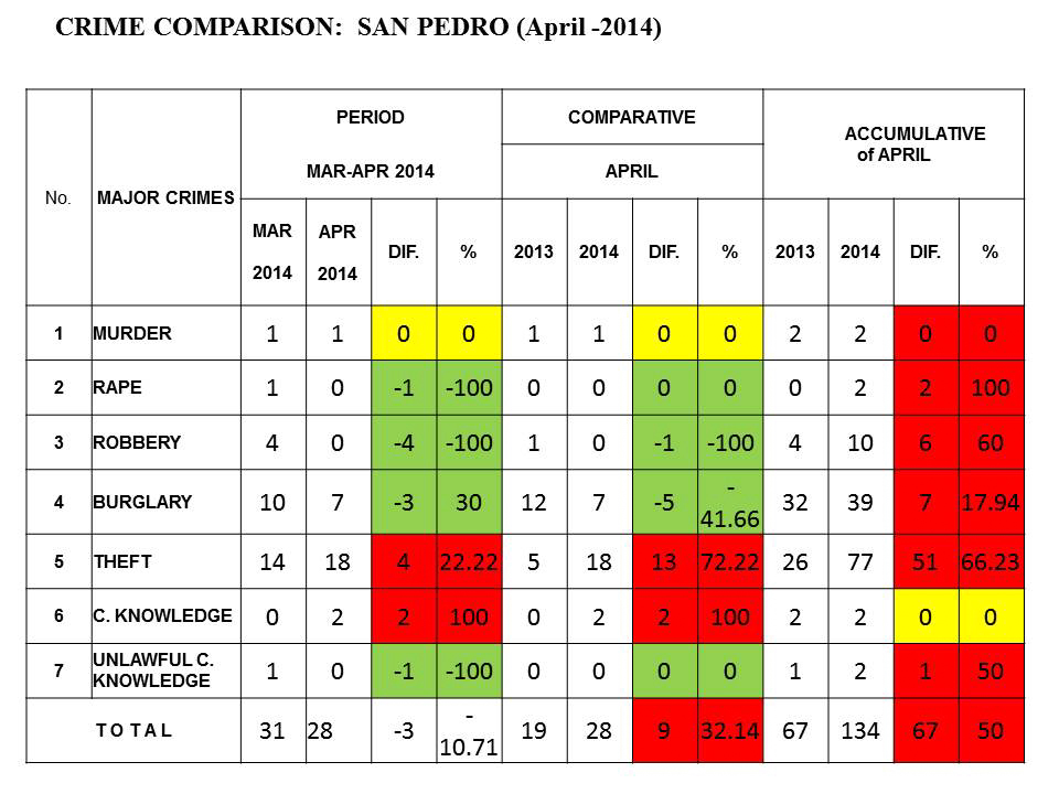 The San Pedro Police Department has released the crime statistics for the month of April 2014. The report demonstrates a steady decrease in major crime and stagnation of minor crimes such as burglary and theft for San Pedro Town, while Caye Caulker Village is seeing an exponential increase in crime.