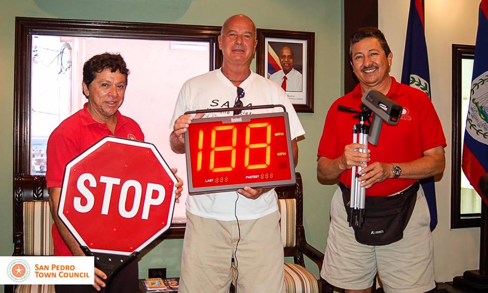 On Monday, June 23rd the San Pedro Traffic Department (SPTD) received a donation from Wolfgang Wind. The generous gift came in the form of a STOP sign equipped with LED lights, a Bushnell Speed Screen and a Bushnell Velocity Speed Gun equipped with a tripod stand. The donation was presented to Mayor Daniel Guerrero and Head of the SPTD Chris Nuñez.