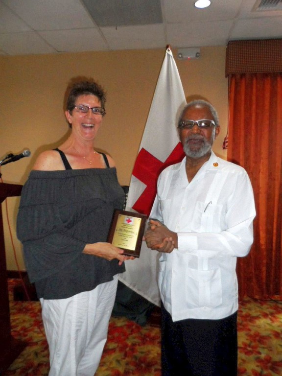 Also being awarded was Sue Barkhouse, who received the Outstanding Volunteer award. Nominated by branch coordinator, Shirlee Arnould, Barkhouse started working with the Belize Red Cross – San Pedro Branch in 2014. “A retired college professor originally from Canada, Sue attended a San Pedro Branch Red Cross meeting in November, 2014 after first volunteering at a blood drive earlier that month, after a friend had been in need of blood. She immediately stepped up to take on the role as Co-Health Committee leader – Blood Drive Coordinator. Sue has successfully coordinated and hosted blood drives in San Pedro which have been held every three months where the average in take has been 30 pints. She has also attended other trainings offered by the Belize Red Cross and has been ever present at branch meetings and events. Sue has definitely qualified for outstanding Volunteer for 2015,” said Norton.