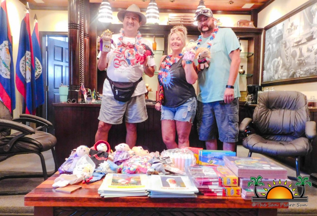 On September 20th, Dede Gordon, Jason Burris, alongside Karen Brodie presented donations to the “ Return to Happiness” program being run under the Sustainable and Child Friendly Municipality of the United Nations Children’s Fund (UNICEF) at the San Pedro Town Council( SPTC). The donation included school supplies donated by Gordon and Burris, puppets by Jamie Cozby, 30 books donated from a past visitor of the island Rosleyn Pierce, and 10 story books gifted by Cori Sterrenberg.