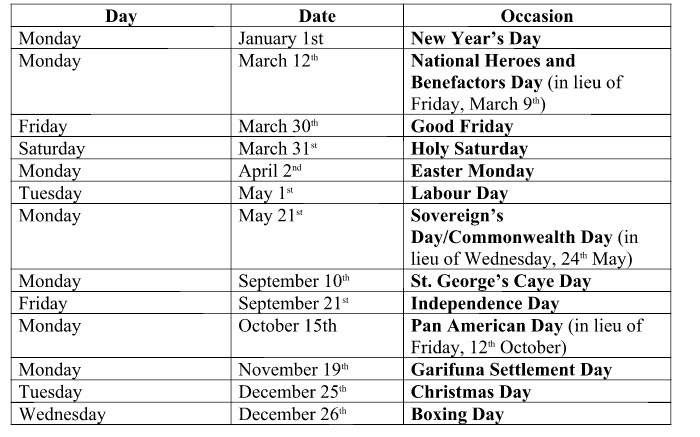 IT IS NOTIFIED for general information that public and bank holidays specified in the First and Second Schedules to Holidays Act, Chapter 289 of the Laws of Belize, Revised Edition 2000 – 2003, will be observed on the following days during the year 2018 in accordance with section 3 of the said Act:-